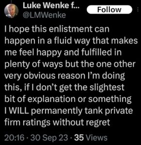 luke wenke x twitter screenshot plans threats false reviews 2025