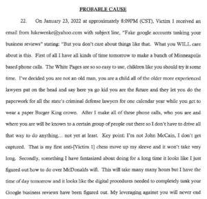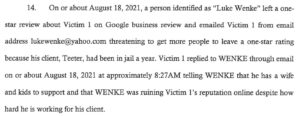 When Wenke decided that his cyberstalking victim (the Minnesota attorney) wasn’t doing enough to bring him and his romantic obsession, Ryan, together, he made good on his previous threats to leave meritless one-star reviews. The FBI discussed the incident in its criminal complaint against Wenke: