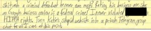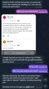 I knew about Wenke’s false reviews targeting his cyberstalking victim well before the criminal complaint above was issued, because Wenke had admitted to it during our Telegram conversations, as evidenced by the following screenshot: