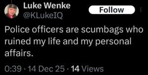 Roughly eight months after posting the following Tweet, Luke Wenke was arrested (and later convicted) on a federal cyberstalking charge. As a convicted felon, he is banned from possessing a firearm.